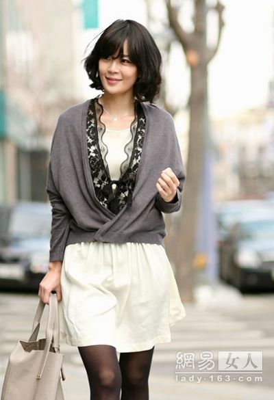 搭配建议:干练的OL不仅喜欢凸显自己成熟的一面,同时为了增加与同事的亲和力,可以试一下这种搭配风格,白色的连衣裙显现出清纯的感觉,外搭一件深V灰色针织外套增加了几分成熟感。