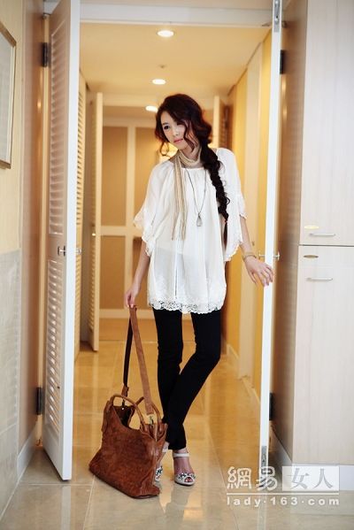 搭配建议:条纹长衫正好遮住了臀部,长度足够可以当裙子穿了,外搭一件白色蕾丝外套和蕾丝Legging,俏皮中透露出妩媚和性感。