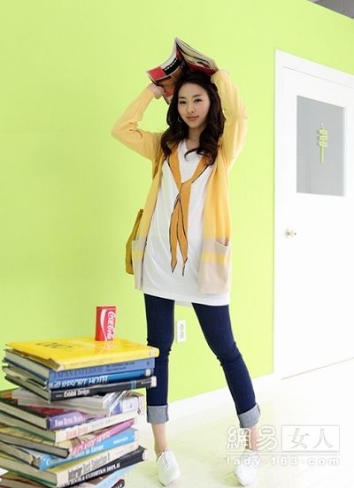 搭配建议:白色长T搭配黄色开襟针织衫,展现出朝气蓬勃的青春活力,一条七分卷边牛仔裤搭配白色休闲鞋,又显出几分俏皮感。