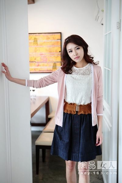 搭配建议:白色蕾丝质地显得更加有女人味,镂空的设计让女性散发出一丝性感,搭配一件牛仔裙、咖啡色宽腰带和粉色针织外套,增加了几分淑女气质。