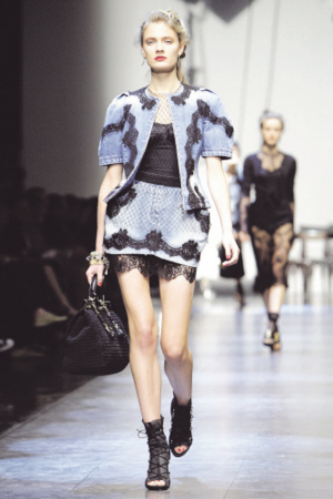 除了House of Holland运用黑色蕾丝和纯蓝牛仔拼接,在Dolce&Gabbana2010春夏系列中,也出现了一组蕾丝镶边的牛仔设计,蓝色牛仔布是基础面料,用蕾丝镶饰,打造出紧身上衣和铅笔裙的轮廓,有一种现代的转变。这组作品还包括灯笼袖的牛仔夹克、短裙和花苞形的吊带裙,给这个以性感为基调的品牌注入了更多碰撞元素。
