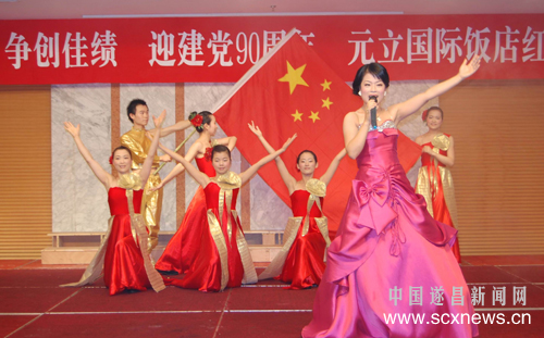 红歌献给党,句句颂党恩。昨晚,元立国际饭店举办“勇当先锋,争创佳绩,迎接建党90周年红歌会”。大合唱《十送红军》、《我的祖国》、《唱支山歌给党听》,歌伴舞《五星红旗》、《南泥湾》等红色经典歌曲唱出元立饭店全体员工的拳拳爱党深情。
