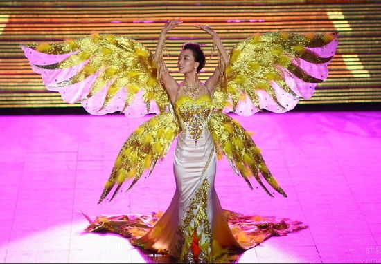 第八届金鹰电视艺术节王珞丹身“插”一对金色大翅膀,在开幕式一开场便华丽金色长裙曳地,踏着星光“从天而降”,在众多舞蹈演员的簇拥下缓缓起舞,示意金鹰展翅。