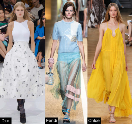 这一季同样有设计感的服装也来自Fendi,光面材质短袖上衣配上透视长裙,透露出小性感和现代感;而Chloe的嫩黄色轻薄长裙也体现了春天的明亮和轻柔。