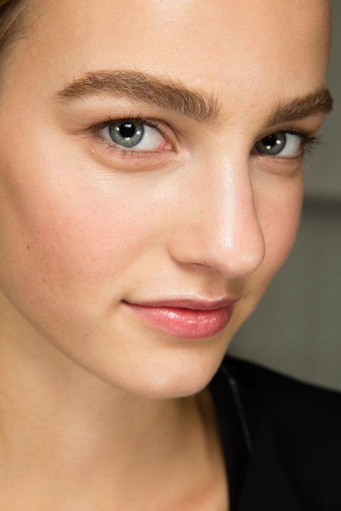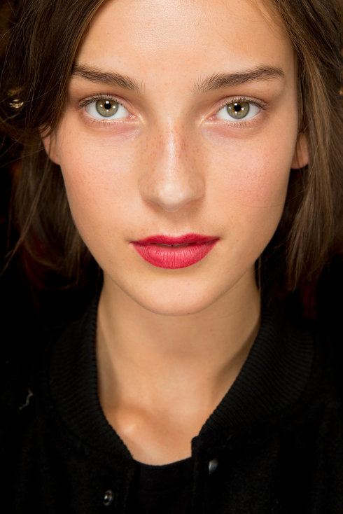 BurberryProrsum的妆容是经典红唇,裸透底妆,红唇以丝绒质地的唇膏,持久不脱妆。Miranda的中性服饰需要女人味的妆容来平衡,所以红唇妆是体现女性特质的绝佳妆容。