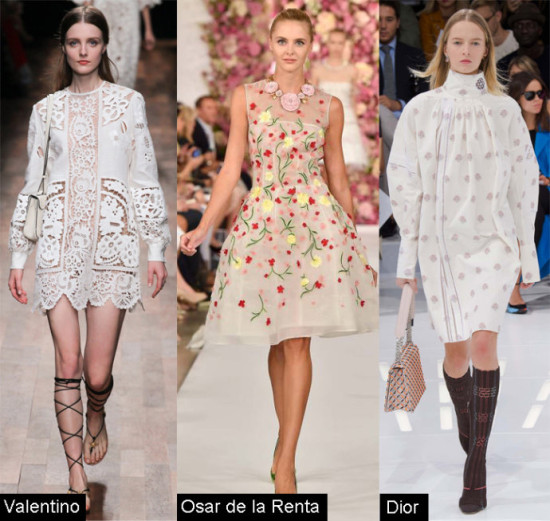 同样的清新飘逸感来自Oscar de la Renta和Valentino。Oscar de laRenta的“后花园系列”带来春天的即视感,轻薄蓬纱裙缀上暖色花朵,清新气息扑面而来;Valentino的纯白镂空连衣裙也将仙气发挥到极致,这是一个浪漫少女的衣橱必备裙装。