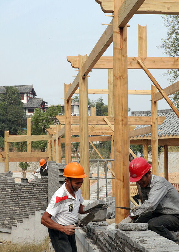汤公园建设进展有序,目前已完成牡丹广场、戏台、童趣台、鸟语台等项目建设,路面配套绿化等也将开始实施,整个工程预计在年底完工。图为工人在建设文化长廊。