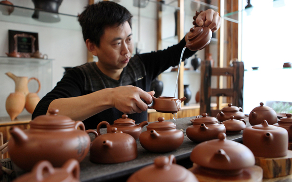 遂昌“世外陶园”黑陶厂创办者夏利长通过一年多的研制和上百次的实验,日前,终于成功烧制出用本地特有的金丝红泥为原料的陶瓷茶具,该陶瓷茶具集观赏、收藏、实用为一体,并通过国家权威部门检测,真正做到了无铅无镉。图为夏利长在测试茶壶的出水情况。