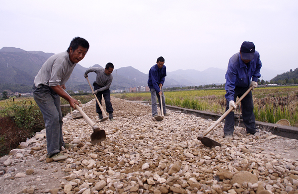 日前,石练镇白西畈山区小流域农业生态工程项目开工建设,该工程总投资1430万元,涉及淤溪村、迎新村、柳村村等7个行政村,项目包括溪流护岸、堰坝和灌溉渠道、电灌站等建设内容。图为工人正在铺设石子,为下步硬化机耕路作准备。