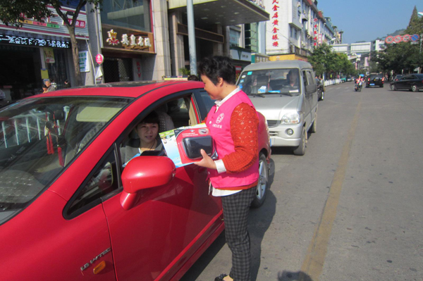 日前,县环卫处联合交警大队举行“文明出行,勿抛车窗垃圾”宣传活动,环卫处巾帼志愿者们走上街头向过往车辆发放“垃圾不落地”倡议书和“文明出行,勿抛车窗垃圾”海报,并免费发放车载垃圾桶。