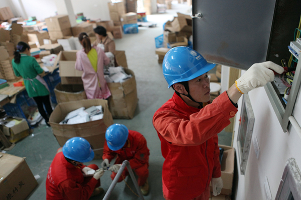 我县是名副其实的淘宝县,目前拥有网店1500余家,农村淘宝“赶街”服务站180多个,6000余人直接从事网店经营。图为国网县供电公司工作人员正为网商企业检查用电线路。