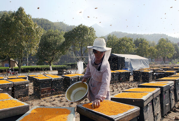 眼下正是茶树花盛开时节,我县盛开的8万亩茶树花,吸引了来自全国各地的养蜂人。由于我县茶树园面积大,蜜蜂每天都能从茶树花上采到好几十公斤的茶叶花粉,这些花粉颗粒大,且特别纯正,产出的蜂蜜价格更贵。图为来自江山市的养蜂户邱菊花在采集花粉。