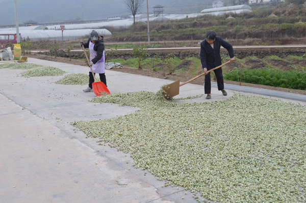高坪乡是我县“遂昌花”的种植大乡,现有种植面积14000多亩,已成为该乡农民的“致富花”。图为收购商利用近期晴好的天气晒干花。