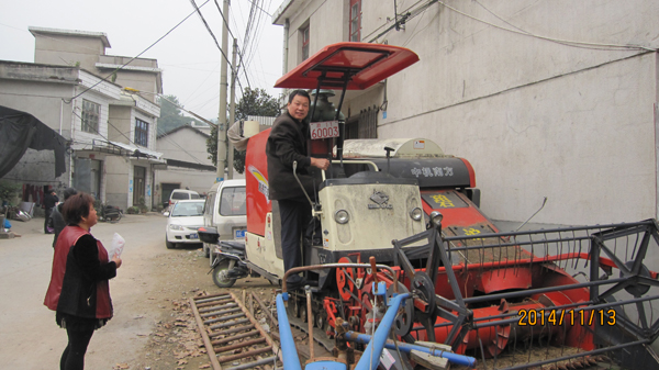 近日,县农机管理站工作人员深入各乡镇(街道)、村,主动上门为2014年购买的手扶拖拉机、联合收割机机主免费办理牌照,深化“为农民办实事、解难题”活动。图为工作人员为车子挂上新牌照。