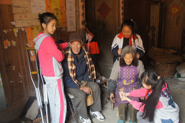 日前,应村乡中心小学开展了“汇爱心尽孝道我先行”主题系列活动。同学们在老师的带领下,对应村村的五保老人进行走访,为每一位老人送去围巾、手套等冬季用品。图为同学们在给老人捏背、捶腿。