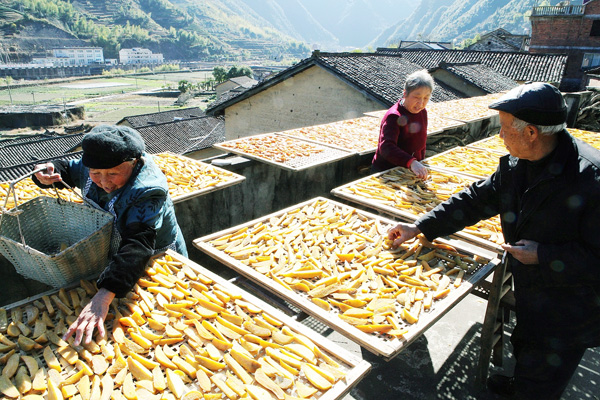 连日来,天气晴好,黄沙腰镇家家户户忙着晒番薯条。该镇番薯条因种植土壤适宜、制作工艺传统,深受消费者喜爱,随着番薯条走俏市场,价格也是节节攀升,番薯条俨然成了群众致富的“黄金条”。图为仙人坝村村民巫春利一家在翻晒番薯条。
