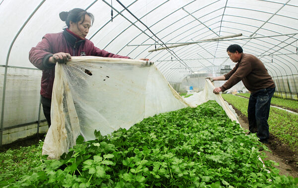 受强寒潮影响,20日至25日我县将迎来严重的雨雪冰冻天气,特别是夜间气温低下,今日,在妙高街道东峰村蔬菜基地里,菜农们给蔬菜加盖第二层薄膜,防御冻害影响。