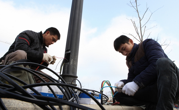 日前,北门至三墩桥、三墩桥至吴突头道路两侧的190多盏路灯安装完毕。图为工人们忙着进行最后的电线连接。