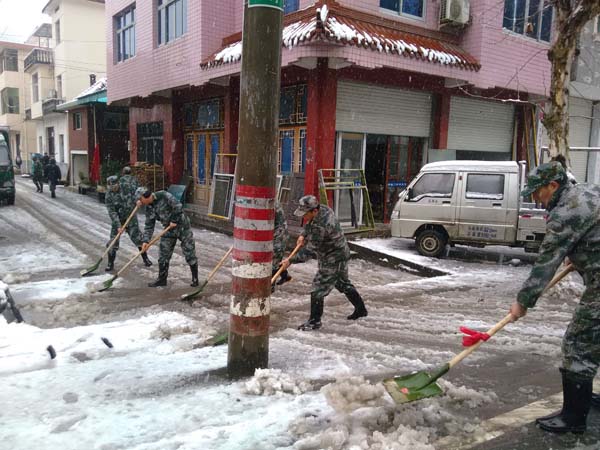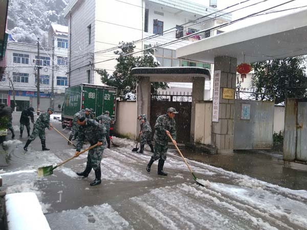 暴雨天气出现后,今日,北界镇人武部第一时间集合民兵应急分队展开行动,上午,对集镇道路、敬老院等场所道路积雪进行了清扫,下午,安排了部分民兵协助电力部门对苏村源的电力设施进行抢修。