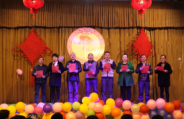 2月13日晚,妙高街道上江村举行“党旗引领幸福上江”新春文艺晚会,全村男女老少欢聚一堂,16个精彩节目让村民们在欢声笑语中度过难忘的夜晚。图为村两委班子成员齐唱“歌唱祖国”。