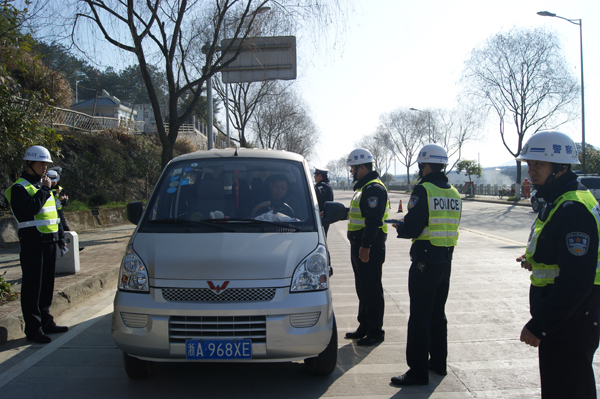 2月15日,县交警大队组织警力对交通违法行为进行集中整治,查处面包车违规载人、客车超员、无证驾驶、无牌无证等交通违法行为,以确保节后春运安全。图为交警在牡丹亭路对过往车辆进行检查。