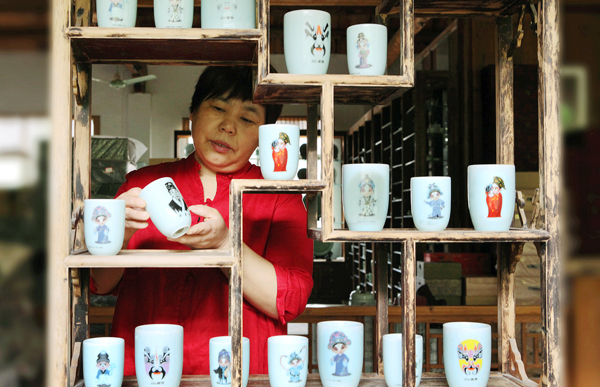文昌青瓷厂负责人廖丽莲在展示印有汤显祖戏曲人物的青瓷。遂昌文昌青瓷厂将传统青瓷工艺和汤显祖文化相结合,创作出多个具有实用和收藏价值的汤显祖文化青瓷作品,丰富了我县旅游、文化产品。