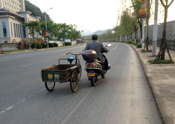 近日,在县城平昌路,一男子单手骑着电瓶车,一手还扶着一辆三轮车在马路上行驶。由于其一人操作两车,难以掌握平衡,一路上车子摇摇晃晃,过往行人纷纷避而远之。县交警大队民警发现该男子的违法行为后立即对其制止,并进行批评教育。民警在此提醒广大市民:不要因一时的便得,将交通安全置之不理。