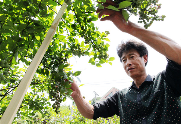 曾小根用竹片支撑起硕果累累的蓝莓。新路湾镇新路湾村村民曾小根致力于蓝莓苗的本土化培育,并建成集苗木出售、蓝莓采摘为一体的观光园。目前,在他的蓝莓园里,串串蓝莓挂满枝头,即将进入采摘期。据悉,果子成熟将持续到6月底。