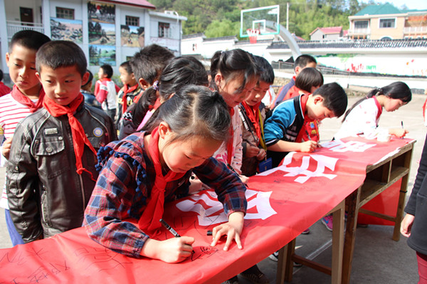 近日,西畈小学开展“珍爱生命,预防溺水”主题系列教育,通过播放宣传片,在横幅上签名,介绍预防溺水和溺水救护方法等各类安全知识,进一步提高学生的安全防范意识和自我保护意识。图为学生正在宣传横幅上签名。