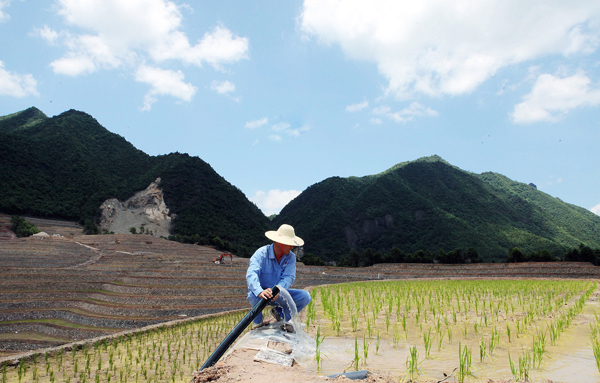 今日,一工人对稻田进行灌水。目前,黄沙腰镇黄塌洋垦造耕地项目上,近300亩的水稻种植完毕,已完成种植面积70%以上。据悉,该项目开发水田面积400亩,是我县今年最大的开发项目之一。近两年来我县垦造耕地项目达到8000多亩,所开发的项目以土地流转等形式租给种植户种植高山稻谷、车厘子、青钱柳等,转“活”了山区经济,有效促进地方经济发展。