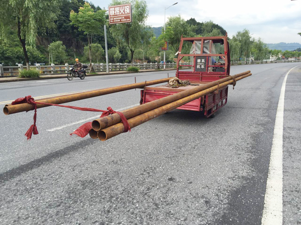 日前,一辆“身材娇小”的三轮摩托车装载了5根超出其身长几倍的钢管在元立大道上行驶,既危险又违反了交通法规。交警提醒广大驾驶员,车辆载货要严格遵守交通法规,严禁超载、超宽、超长、超高的违法行为。