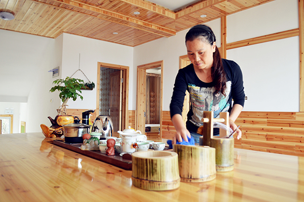 今年以来,王村口镇山枣坪村依托当地生态优势,开始发展农家乐。据悉,第一批农家乐已经完成装修,准备在国庆节前开始营业。图为农户正在打扫新装修好的农家乐。