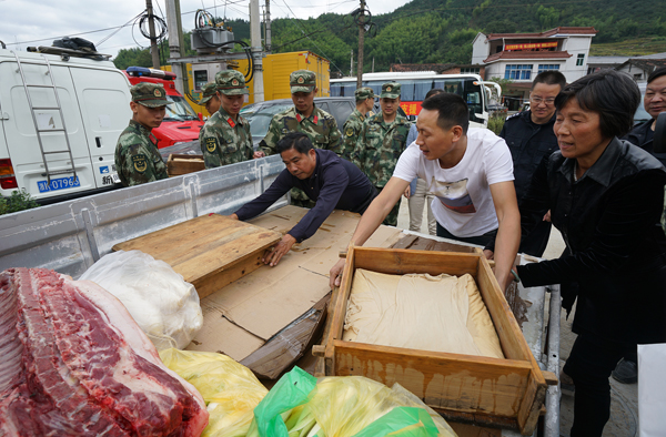 昨日,新路湾镇小马埠村村民将蔬菜、肉以及亲手做的豆腐送到苏村灾区,慰问在一线救援的人民子弟兵,表达他们的一份谢意。