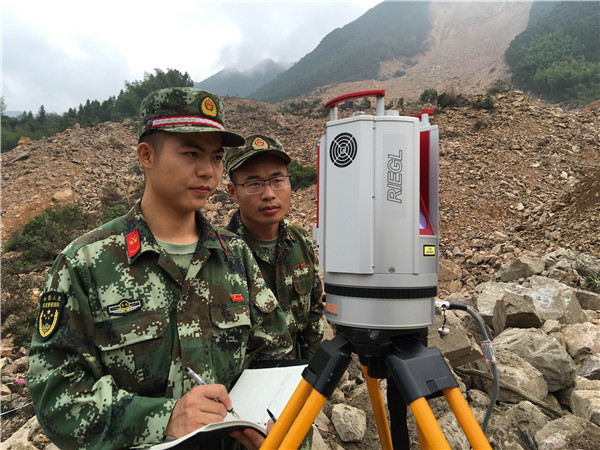 为实现精准、高效救援目标,救援部队运用高精尖装备全面监测救援现场。图为官兵使用三维激光扫描仪实时监测滑坡残留体位移变化。