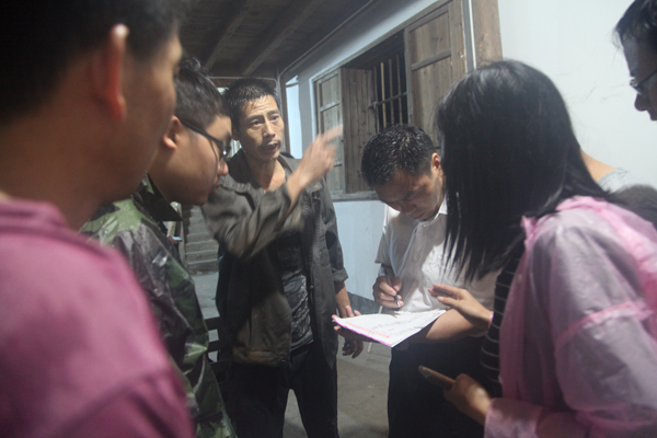 苏村山体滑坡当夜,村民潘青海多次冒雨进入滑坡现场救援村民。图为潘青海在和救援组讲述现场滑坡、救援等情况。