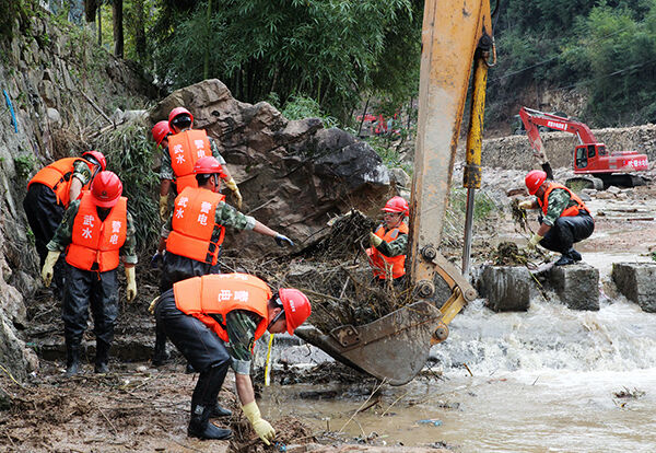 今日,武警水电部队官兵对苏村河道垃圾以及上游冲毁的树木、杂物等进行清理。