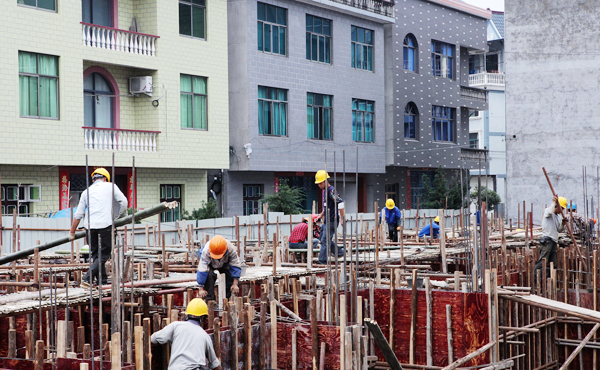 北界镇金钩灾民安置房施工现场,工人们忙着砼墙支模和绑扎钢筋。该安置小区近日将完成砼墙浇筑。