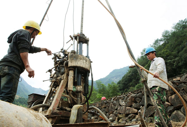 昨日,在苏村灾后公路改建现场,工人们对桥梁建设段面进行地质勘探和土层分析。