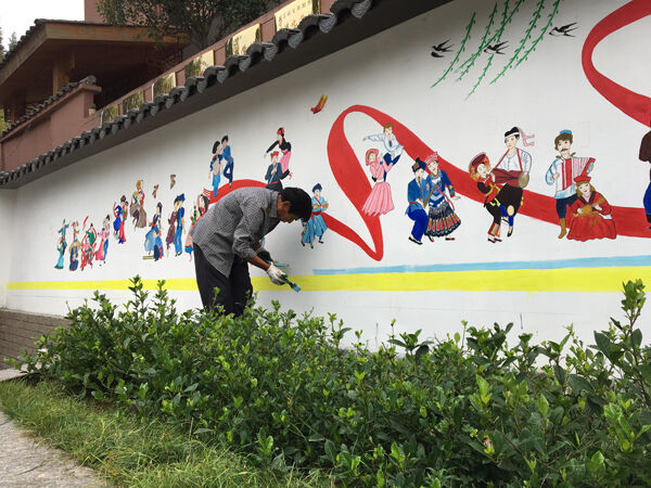 本网讯 颜色艳丽的墙体彩绘,栩栩如生的各类人物,近日,三仁小学校园内民族团结墙彩绘翻新接近尾声,身着56个民族服饰的人物在墙上“载歌载舞”,吸引了不少学生驻足。