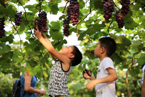 随着葡萄、猕猴桃等水果的逐渐成熟,我县又进入了一年采摘游旺季。休闲小憩时,带孩子欣赏果园美景,享受采摘乐趣已成为市民们的消费新选择。图为三仁畲族乡百果园内,孩童们与新鲜采摘的葡萄合影。