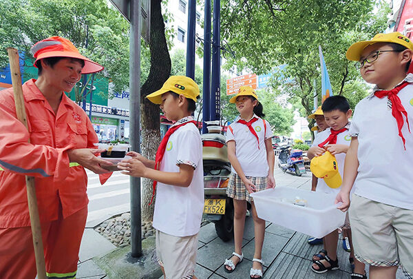 8月18日,妙高小学三(5)班“大拇指中队”的孩子们走上街头,为环卫工人送上他们和家长亲手做的仙草糕、绿豆汤,让一线的环卫工人在炎炎夏日感受到一丝清凉。