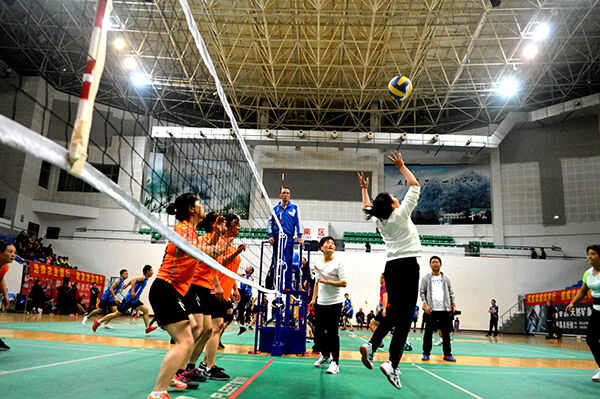 近日,首届“农行杯”2017年遂昌县气排球联赛在县体育馆开赛,来自全县各乡镇(街道)、机关、企事业单位的49支队伍进行为期5天的100多场比赛,旨在进一步推动我县气排球运动的普及与发展。图为比赛现场。