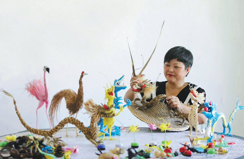 如今,张聪红不仅可以用棕榈叶去编织各种工艺品,还可以利用稻草、麦秆、麻绳、彩带等编织各种工艺品,就算田间地头的一把杂草,在她的手中仿佛也有了生命,摇身一变成为栩栩如生的飞禽走兽。