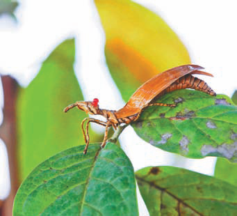 在她手中,叶子慢慢有了“新模样”:翅膀是用浅绿的棕叶编的,上面有淡淡的纹路;触须是用细棕丝拧的,轻轻垂着;身体则用深褐的棕篾编出弧度,尽显优雅——