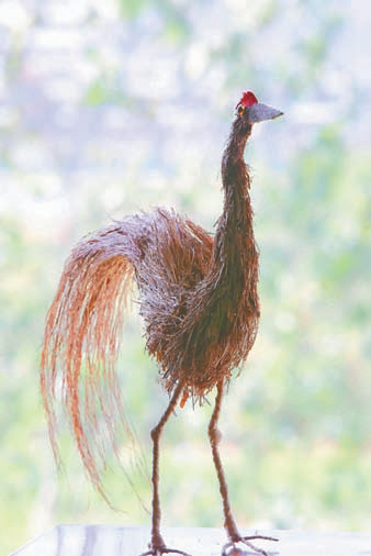 别人丢弃的稻草,她捆起来带回家,在院子里摊开晾晒,直到稻草变得干燥蓬松。棕榈树一年四季可摘,她选取韧性佳的老棕叶,按纹路折叠、扎紧,放入开水煮10分钟,再阴干,这样的棕叶既柔软又不易断裂,编出的作品还带着淡淡的绿意。丰收时节,田里的玉米叶也成了她的“宝贝”:玉米叶韧性强,适合编鸟的脚,麦秆则能嵌成小动物的眼睛,透着灵气。就连路边不起眼的杂草,她也会摘几根试试韧性,“别小看它们,有的草筋骨不错,编出来的鸟尾,有一股盛气凌人的傲娇感”。