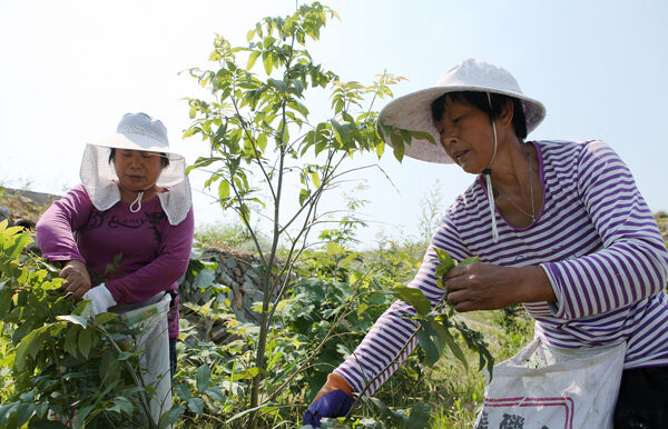 连日来,湖山乡三归村青钱柳基地上,工人们忙着采摘青钱柳叶子。该基地2013年种植的300多亩青钱柳今年已进入投产期,预计能产叶子4000多公斤,主要作为保健茶原材料销售。