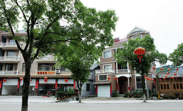 近日,大柘镇大田村对公路两旁、农家乐、汤沐园入口等处的红灯笼进行了更新,将村庄装扮一新,尽显美丽乡村风采。图为大田村一角。