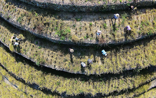 近日,湖山乡三归村垦造耕地项目上,村民在收割旱地稻谷。据悉,今年该乡共种植山稻谷1320亩,平均亩产约150公斤,每公斤山稻谷价格在40元左右。