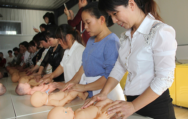 近日,库区移民月嫂培训班在县职业中专开班。来自全县库区50位移民或家属参加了为期7天的培训。培训结束后,学员将参加理论与实践考核,成绩合格者,方可获得《初级母婴护理师》职业资格等级证书。图为学员正在给“婴儿”做抚触。