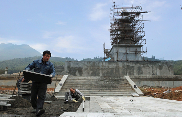 工人们在铺设广场地砖。石练镇淤溪村班春劝农广场施工接近尾声,该项目是淤溪村精品村建设的重要一部分,也是弘扬非遗文化的重要平台,目前,广场神农雕像已完成安装,并通过初步验收。